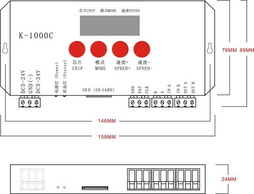 直流5V -24V输入 | 2W | 3pin 接线端子 | 0.35Kg | L159mm*W89mm*H24mmm | 128MB—32GB | FAT或者FAT32名堂 | *.led |