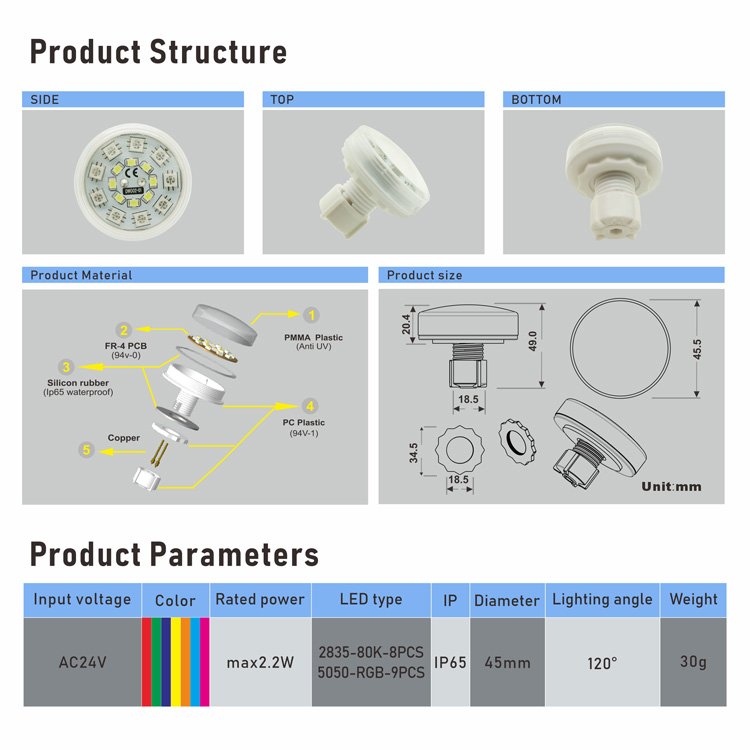2.高品质结构:直径45毫米,,,,,,内置8x2835W和9x5050 RGB高亮度LED,,,,,,240度照明。。。