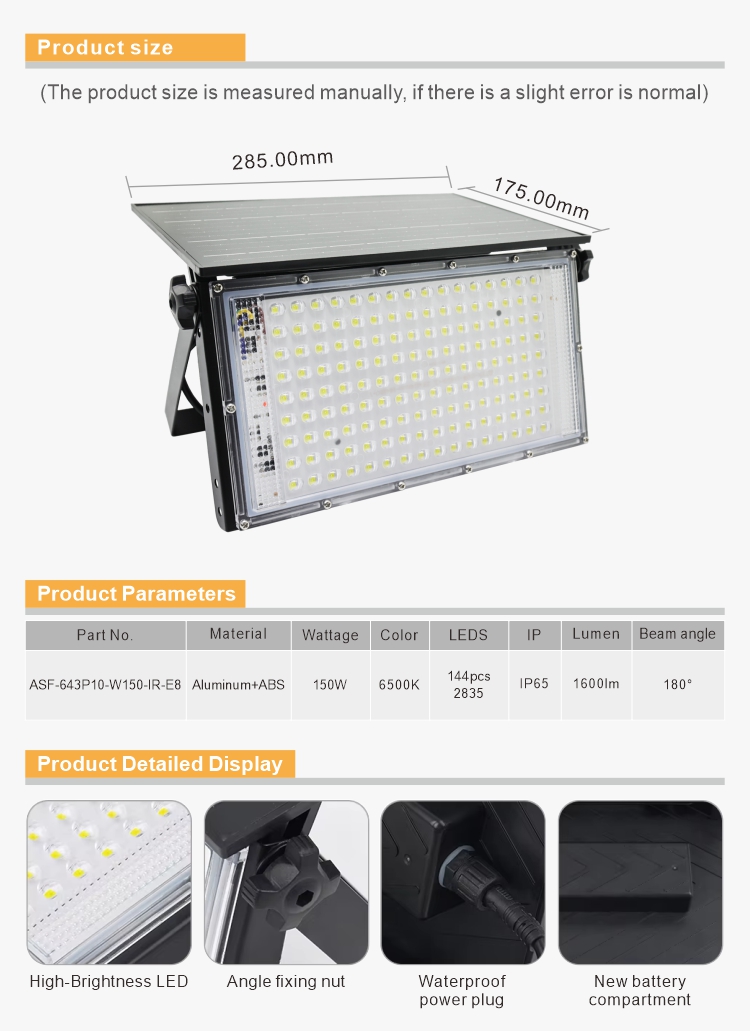户外太阳能投光灯150W太阳能庭院灯产品特点: